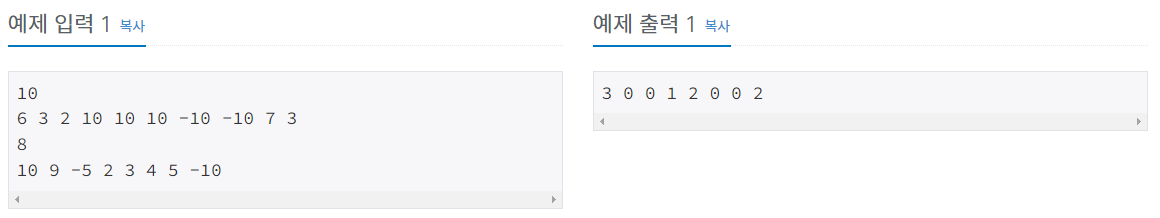 숫자 카드는 정수 하나가 적혀져 있는 카드이다. 상근이는 숫자 카드 N개를 가지고 있다. 정수 M개가 주어졌을 때, 이 수가 적혀있는 숫자 카드를 상근이가 몇 개 가지고 있는지 구하는 프로그램을 작성하시오.