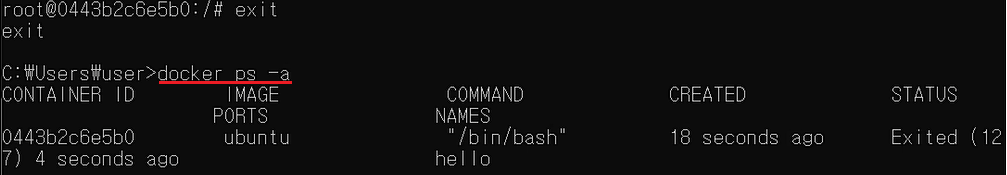 [ps -a // 명령어 목록 전원 확인, 정지된 컨테이너 포함]