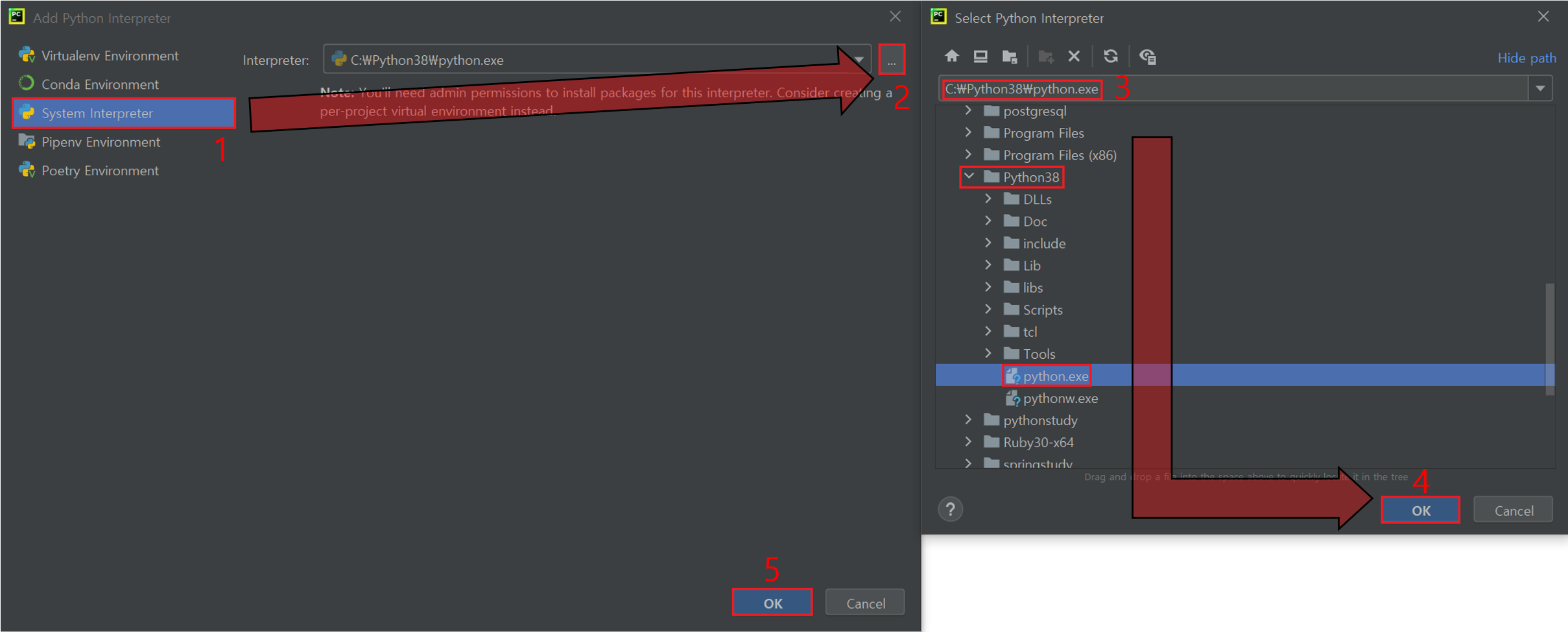 3. Add Python Interpreter → System Interpreter → [...] 마우스로 클릭 → C:\Python38\python.exe 경로 설정 → OK 버튼 마우스로 클릭 → OK 버튼 마우스로 클릭