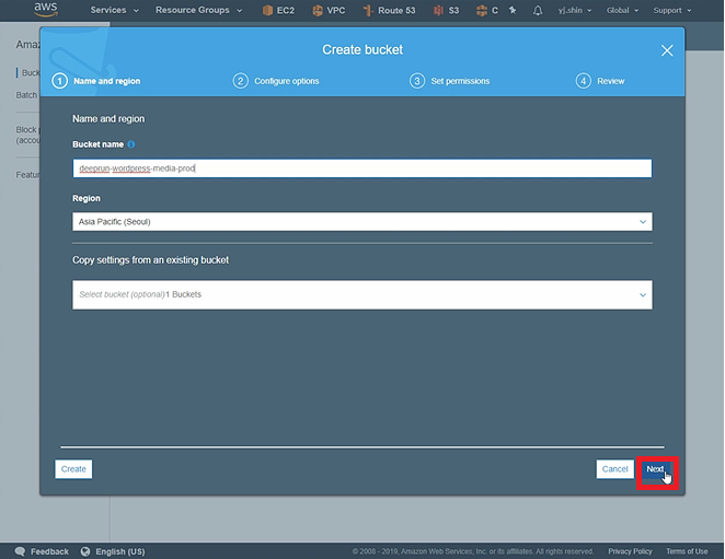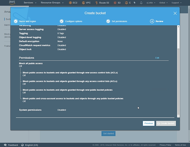 Block all public access 체크 해제 후 Next