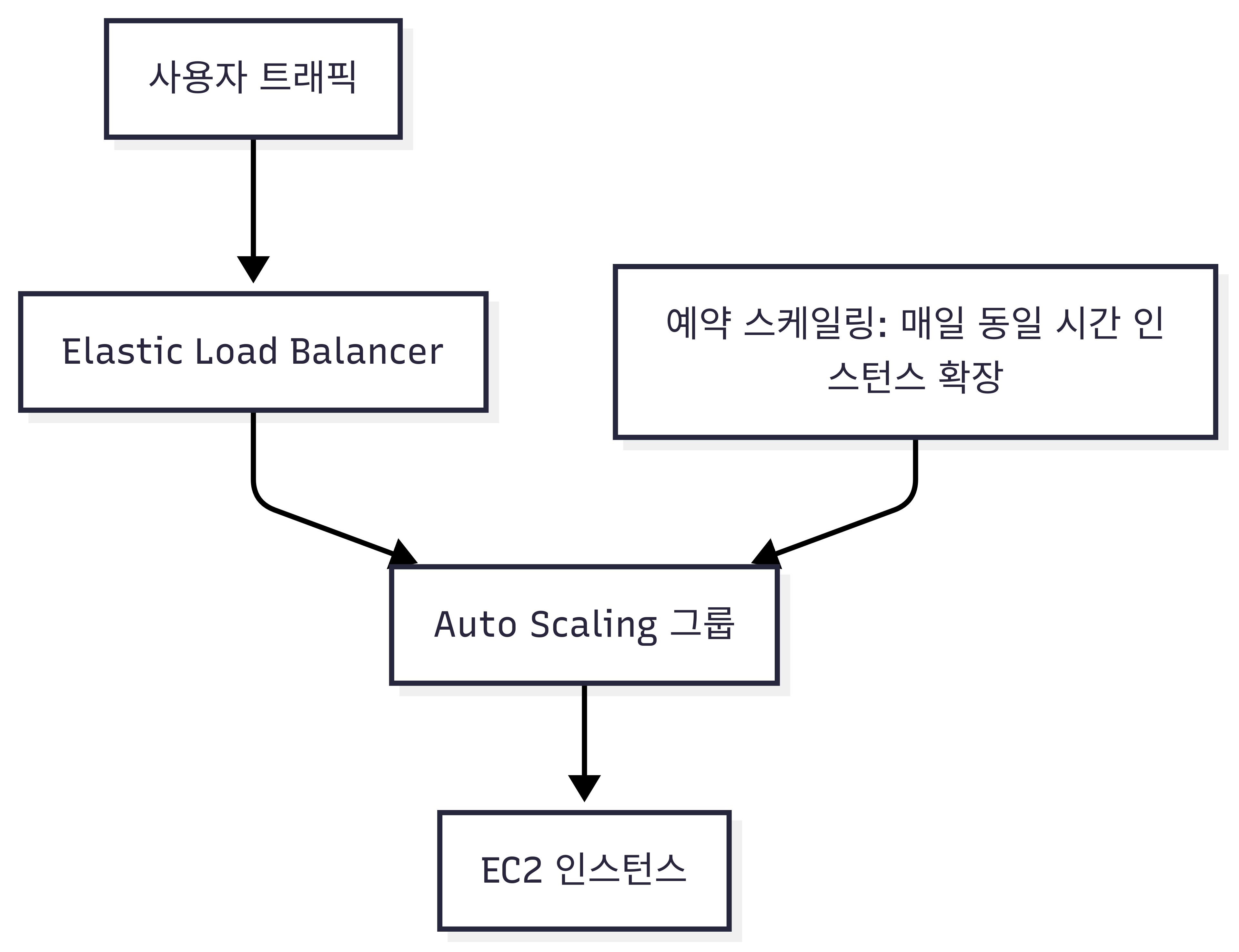 - ์ด ๋ฌธ์ ๋ “๋งค์ผ ๊ฐ์ ์๊ฐ์ ์ฑ๋ฅ ์ ํ” → ์์ฝ ์ค์ผ์ผ๋ง(Scheduled Scaling)์ด ์ ๋ต