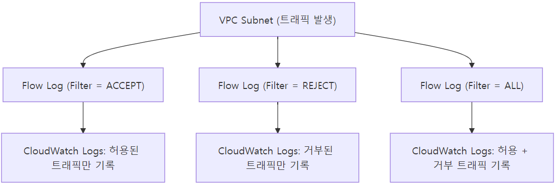 Subnet["VPC Subnet"] --> FlowLog1["Flow Log: Filter=ACCEPT"]