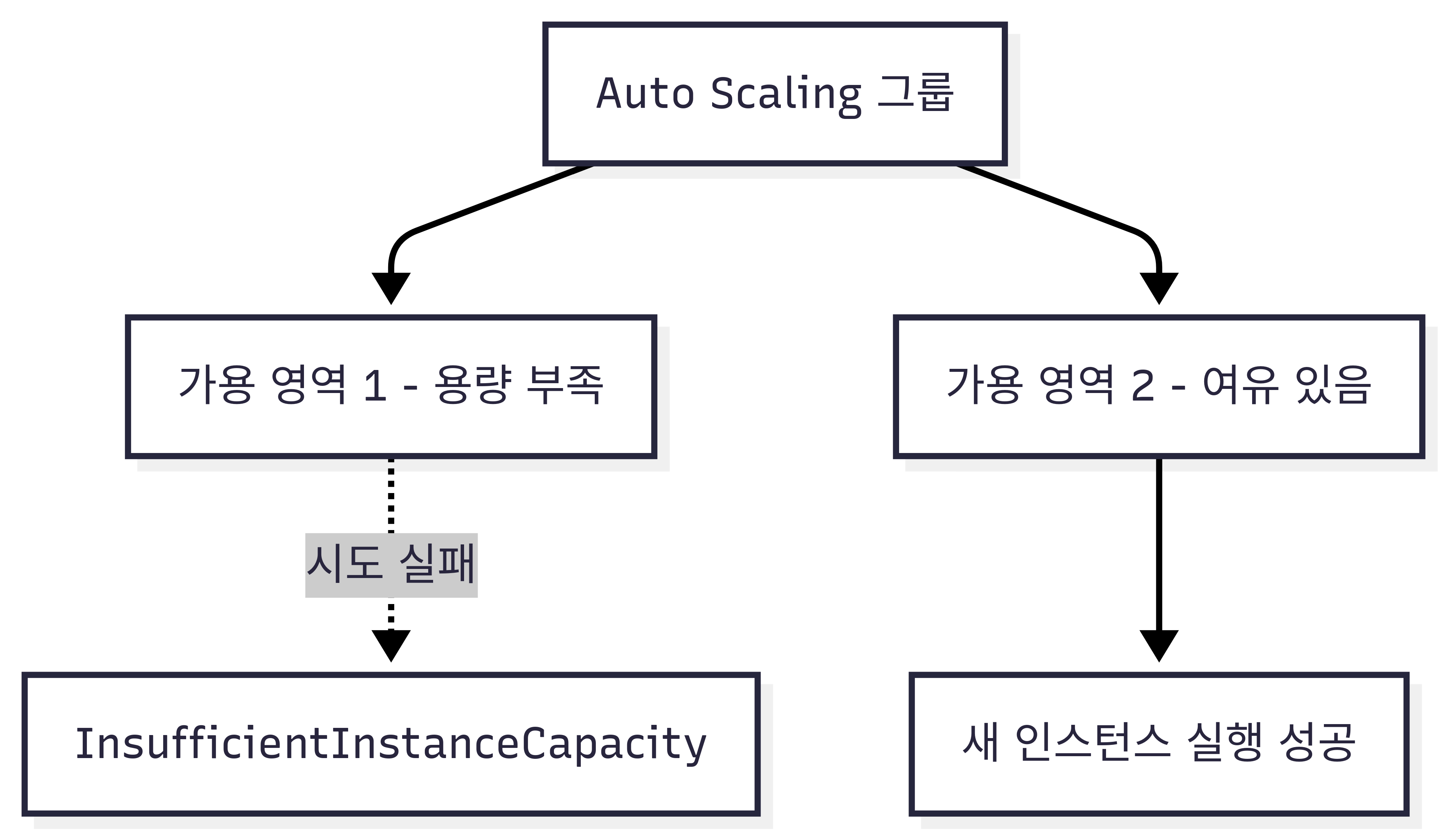 ASG[Auto Scaling ๊ทธ๋ฃน] --> AZ1[๊ฐ์ฉ ์์ญ 1 - ์ฉ๋ ๋ถ์กฑ]