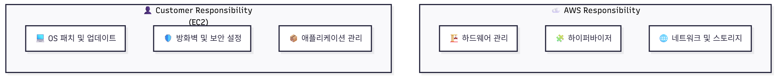 | ๊ณต์ ์ฑ ์ ๋ชจ๋ธ (Shared Responsibility Model) | AWS์ ๊ณ ๊ฐ ๊ฐ์ ๋ณด์ ๋ฐ ์ ์ง๊ด๋ฆฌ ์ฑ ์์ ๋ช ํํ ๊ตฌ๋ถํ๋ ๋ชจ๋ธ |