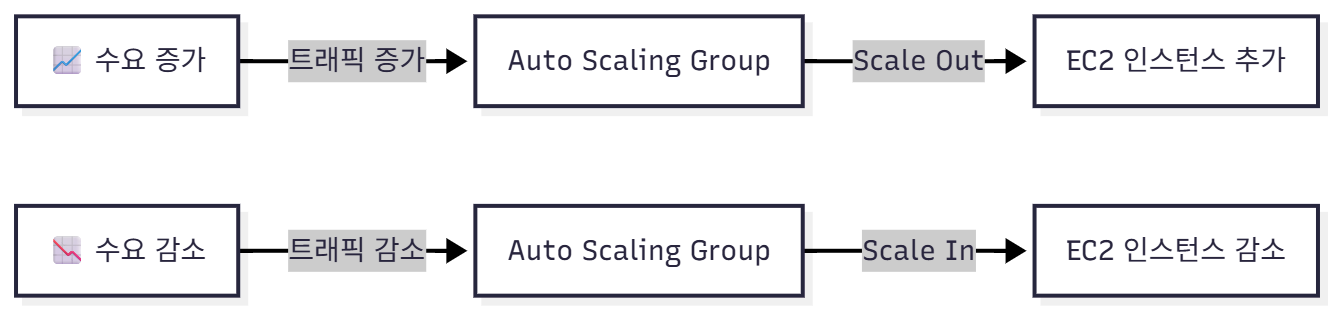 A2[๐ ์์ ๊ฐ์] -->|ํธ๋ํฝ ๊ฐ์| B2[Auto Scaling Group]