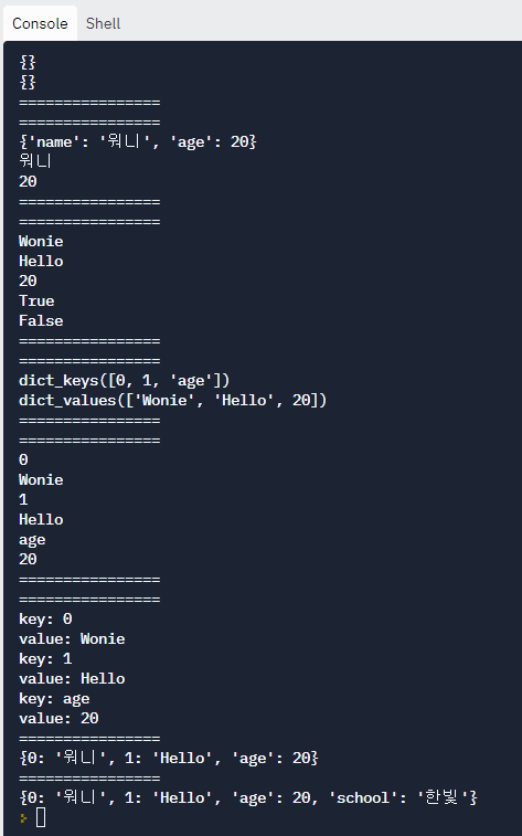 print("name" in x) # name이라는 Key가 x라는 Dictionary(딕셔너리) 안에 들어있는지 확인