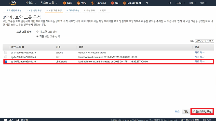 기존 보안 그룹 선택 - LB-Default 체크 후 다음
