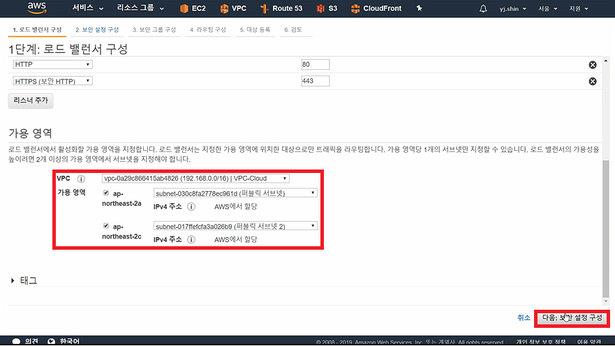 가용영역 - 생성된 서브넷 2개 체크 후 다음