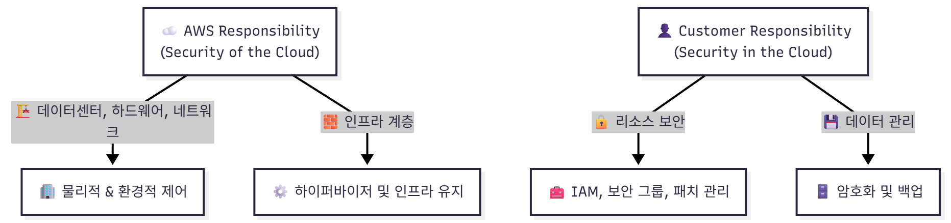 A[AWS 책임] --> B[🔒 Security of the Cloud<br>물리적 인프라, 네트워크, 하드웨어]