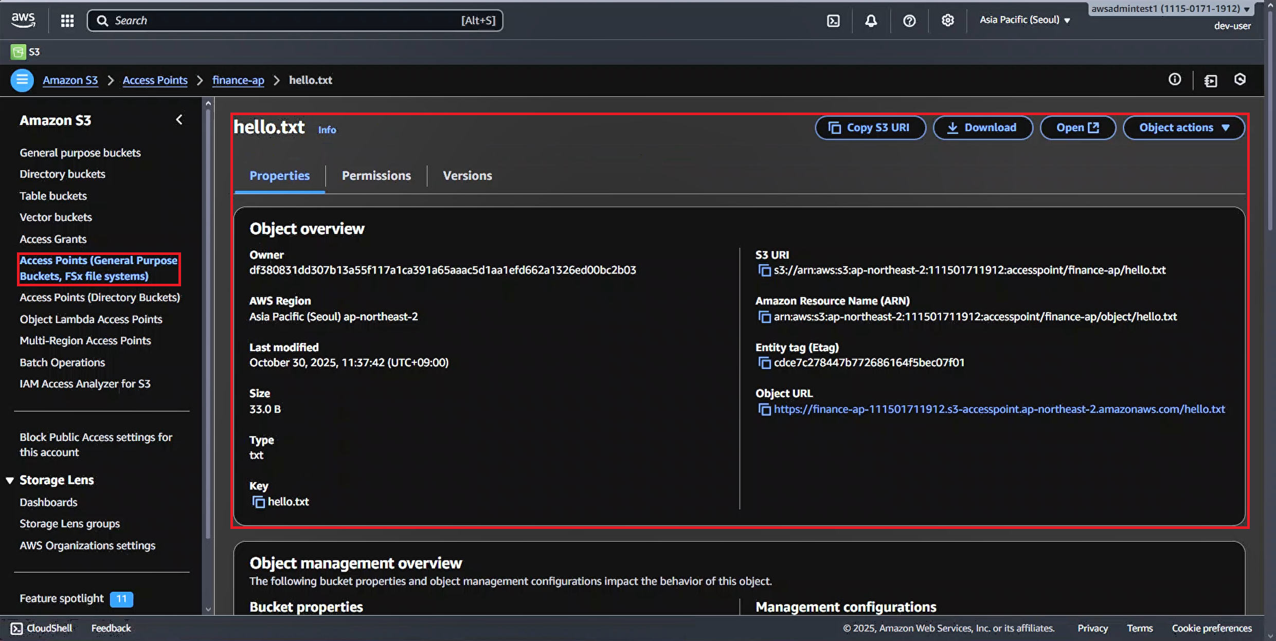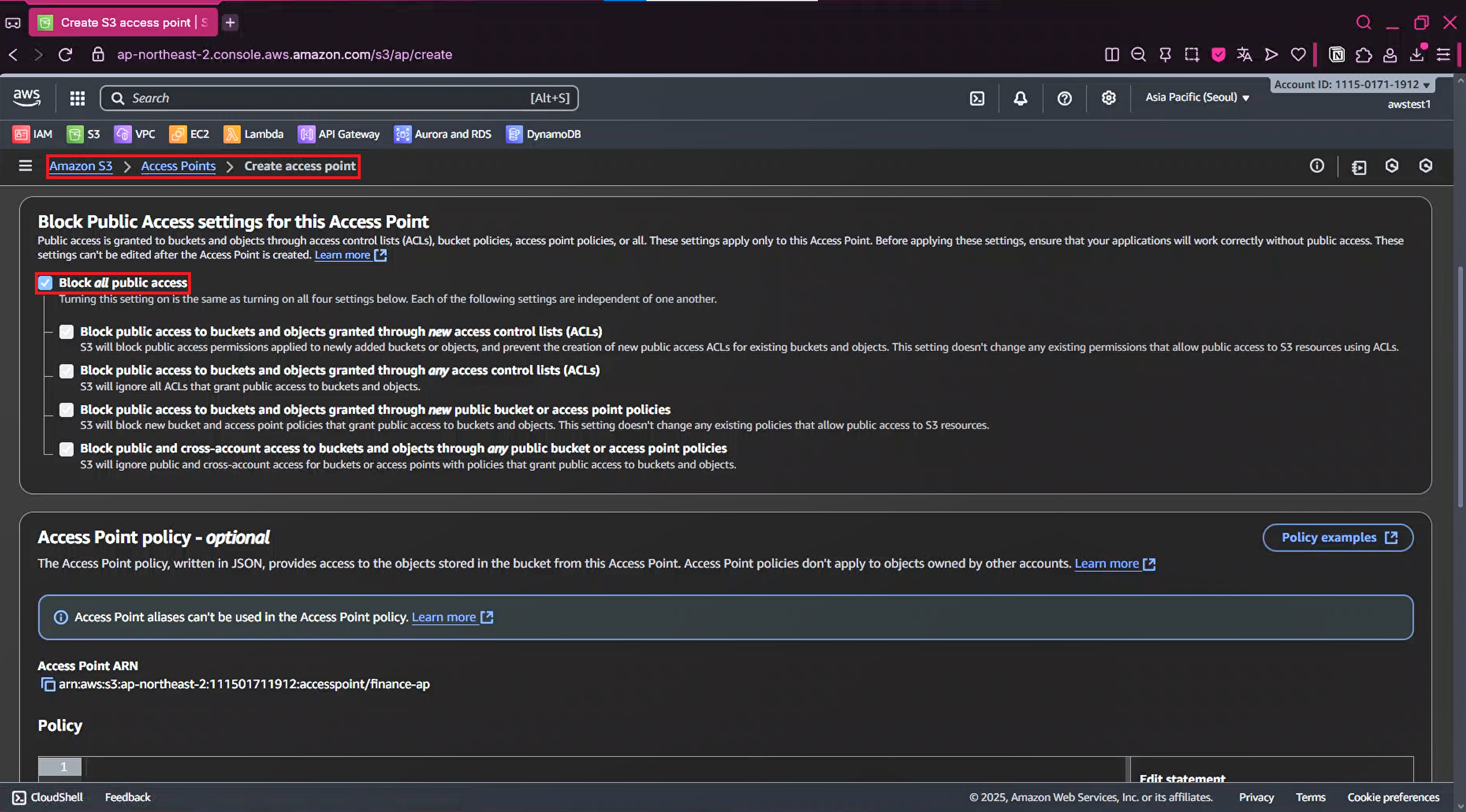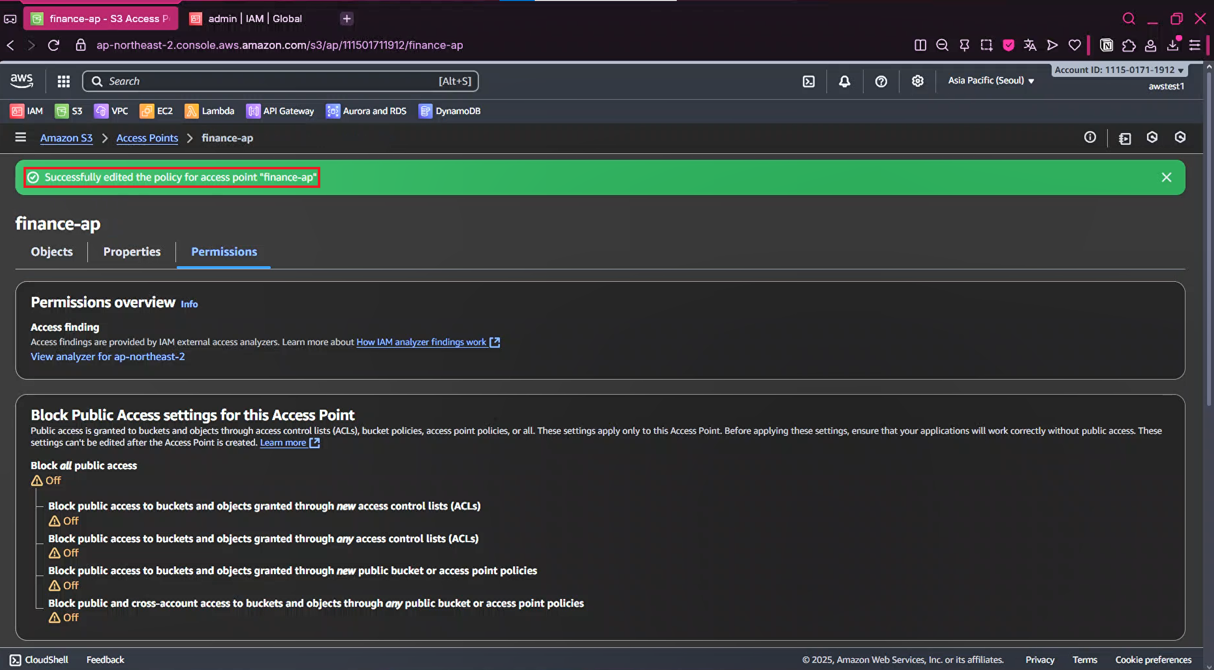 "Resource": "arn:aws:s3:ap-northeast-2:12345678910:accesspoint/finance-ap/object/*"