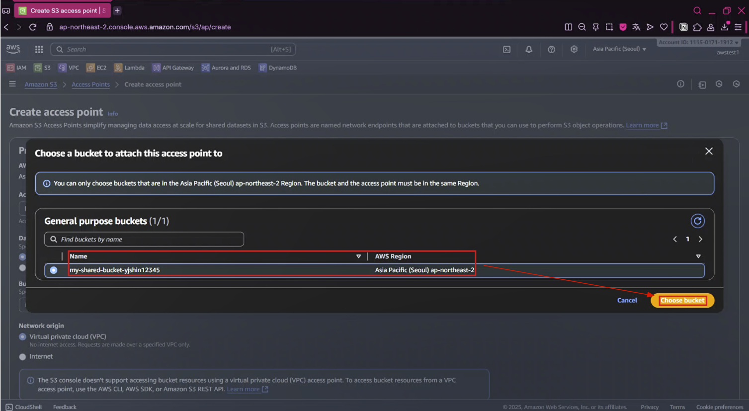2-3. Choose a bucket to attach this access point to 팝업창 뜨면 위에서 생성한 버킷 이름 선택 → Choose bucket 버튼 마우스로 클릭
