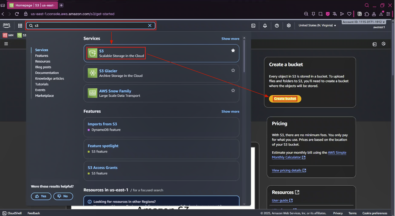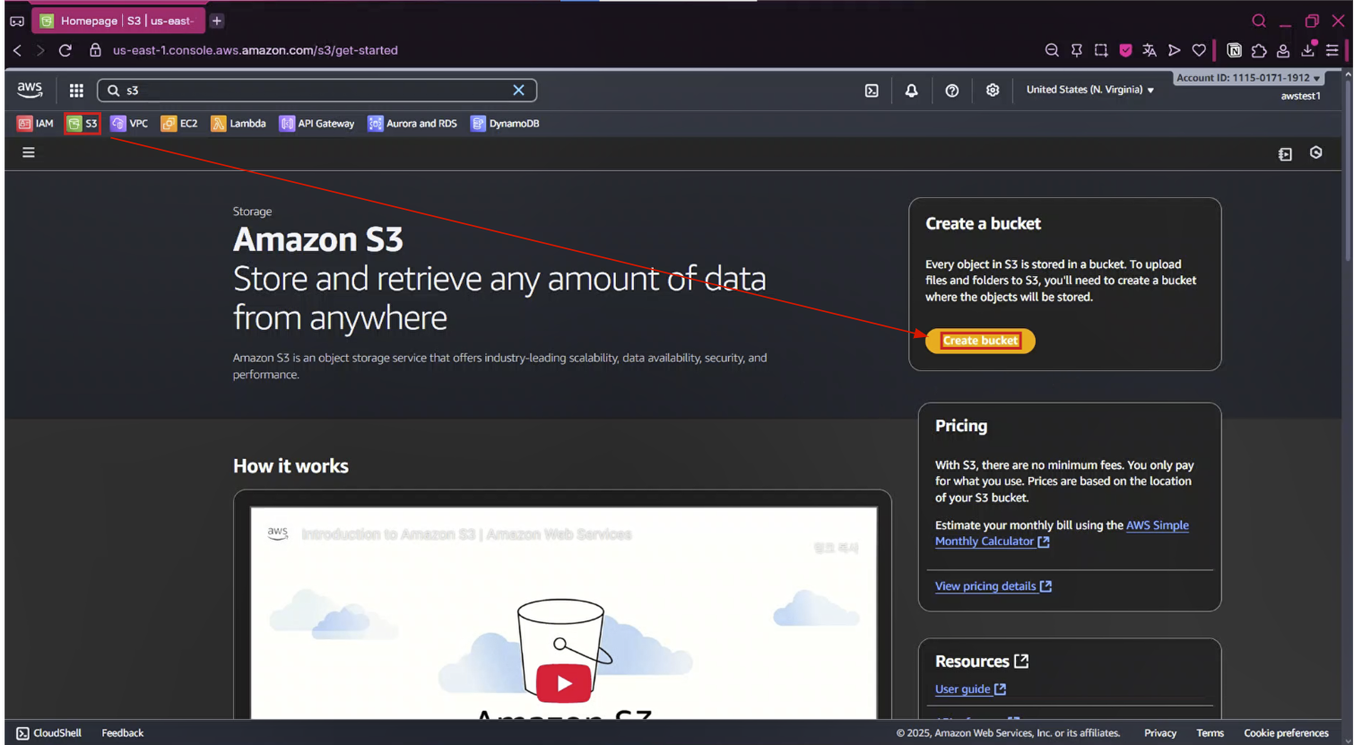 1-1. AWS Console에서 S3 Service 검색 → Create bucket 버튼 마우스로 클릭