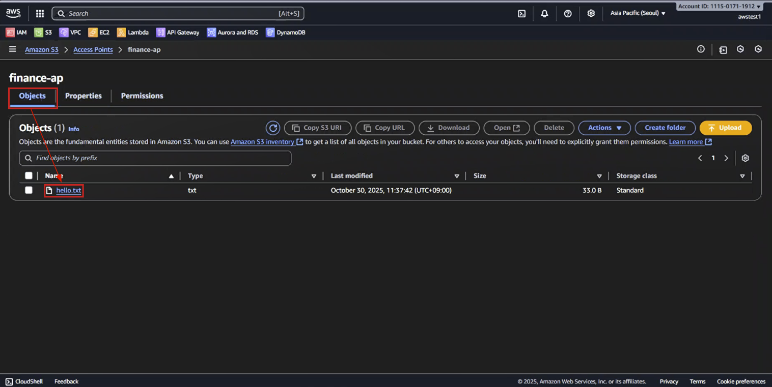 5-1. S3 Access Point - [Objects] 탭 선택 → [Upload] 버튼 마우스로 클릭