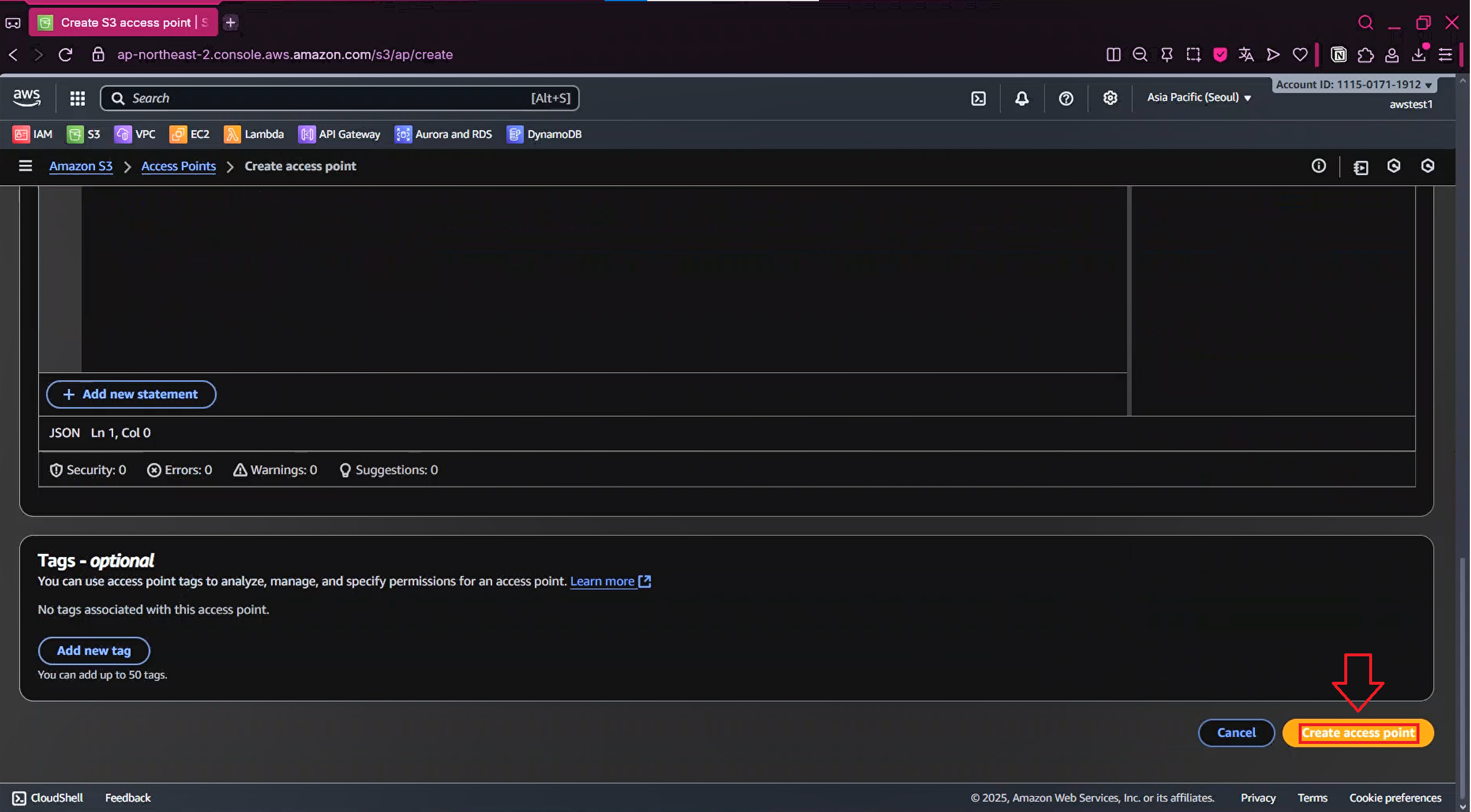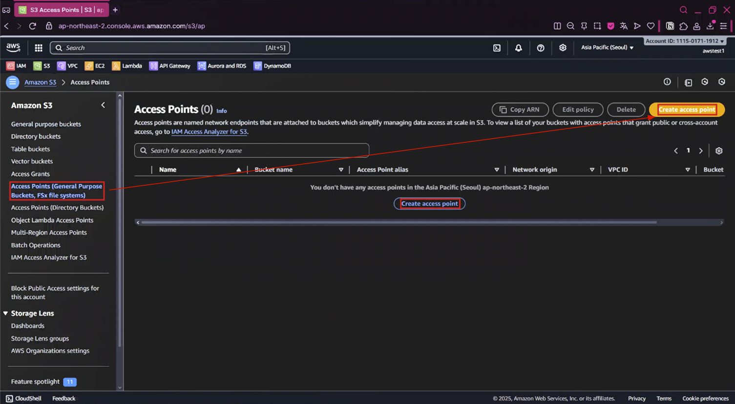 - Access Points (General Purpose Buckets, FSx file systems) 마우스로 클릭