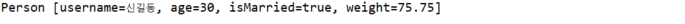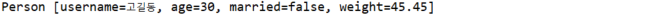 return "Person [username=" + username + ", age=" + age + ", isMarried=" + isMarried + ", weight=" + weight