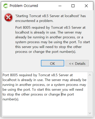 Port 8005 required by Tomcat v8.5 Server at localhost is already in use. The server may already be running in another process, or a system process may be using the port. To start this server you will need to stop the other process or change the port number(s).