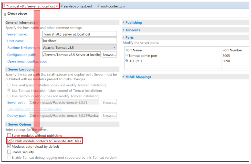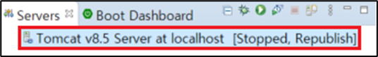 4. Server 탭→ Tomcat v8.5 Server at localhost [Stopped, Republish] 마우스로 더블 클릭하여 실행