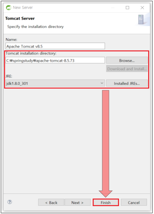 → JRE: → Installed JREs... 버튼 클릭하여 설치한 jdk 버전 선택 → Finish 버튼 마우스로 클릭