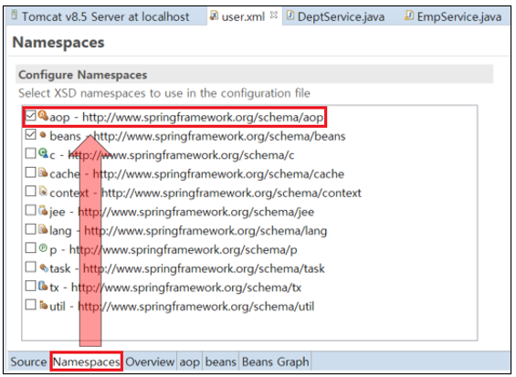 3월 21, 2022 5:22:32 오후 org.apache.catalina.core.StandardContext listenerStart 심각: Context initialized 이벤트를 [org.springframework.web.context.ContextLoaderListener] 클래스의 인스턴스인 리스너에 전송하는 동안 예외 발생 org.springframework.beans.factory.parsing.BeanDefinitionParsingException: Configuration problem: Unable to locate Spring NamespaceHandler for XML schema namespace [http://www.springframework.org/schema/tx] Offending resource: ServletContext resource [/WEB-INF/spring/root-context.xml] at org.springframework.beans.factory.parsing.FailFastProblemReporter.error(FailFastProblemReporter.java:70) at org.springframework.beans.factory.parsing.ReaderContext.error(ReaderContext.java:118) at org.springframework.beans.factory.parsing.ReaderContext.error(ReaderContext.java:110) at org.springframework.beans.factory.xml.BeanDefinitionParserDelegate.error(BeanDefinitionParserDelegate.java:301) at org.springframework.beans.factory.xml.BeanDefinitionParserDelegate.parseCustomElement(BeanDefinitionParserDelegate.java:1432) at org.springframework.beans.factory.xml.BeanDefinitionParserDelegate.parseCustomElement(BeanDefinitionParserDelegate.java:1419) at org.springframework.beans.factory.xml.DefaultBeanDefinitionDocumentReader.parseBeanDefinitions(DefaultBeanDefinitionDocumentReader.java:172) at org.springframework.beans.factory.xml.DefaultBeanDefinitionDocumentReader.doRegisterBeanDefinitions(DefaultBeanDefinitionDocumentReader.java:142) at org.springframework.beans.factory.xml.DefaultBeanDefinitionDocumentReader.registerBeanDefinitions(DefaultBeanDefinitionDocumentReader.java:94) at org.springframework.beans.factory.xml.XmlBeanDefinitionReader.registerBeanDefinitions(XmlBeanDefinitionReader.java:508) at org.springframework.beans.factory.xml.XmlBeanDefinitionReader.doLoadBeanDefinitions(XmlBeanDefinitionReader.java:392) at org.springframework.beans.factory.xml.XmlBeanDefinitionReader.loadBeanDefinitions(XmlBeanDefinitionReader.java:336) at org.springframework.beans.factory.xml.XmlBeanDefinitionReader.loadBeanDefinitions(XmlBeanDefinitionReader.java:304) at org.springframework.beans.factory.support.AbstractBeanDefinitionReader.loadBeanDefinitions(AbstractBeanDefinitionReader.java:181) at org.springframework.beans.factory.support.AbstractBeanDefinitionReader.loadBeanDefinitions(AbstractBeanDefinitionReader.java:217) at org.springframework.beans.factory.support.AbstractBeanDefinitionReader.loadBeanDefinitions(AbstractBeanDefinitionReader.java:188) at org.springframework.web.context.support.XmlWebApplicationContext.loadBeanDefinitions(XmlWebApplicationContext.java:125) at org.springframework.web.context.support.XmlWebApplicationContext.loadBeanDefinitions(XmlWebApplicationContext.java:94) at org.springframework.context.support.AbstractRefreshableApplicationContext.refreshBeanFactory(AbstractRefreshableApplicationContext.java:126) at org.springframework.context.support.AbstractApplicationContext.obtainFreshBeanFactory(AbstractApplicationContext.java:614) at org.springframework.context.support.AbstractApplicationContext.refresh(AbstractApplicationContext.java:514) at org.springframework.web.context.ContextLoader.configureAndRefreshWebApplicationContext(ContextLoader.java:443) at org.springframework.web.context.ContextLoader.initWebApplicationContext(ContextLoader.java:325) at org.springframework.web.context.ContextLoaderListener.contextInitialized(ContextLoaderListener.java:107) at org.apache.catalina.core.StandardContext.listenerStart(StandardContext.java:4763) at org.apache.catalina.core.StandardContext.startInternal(StandardContext.java:5232) at org.apache.catalina.util.LifecycleBase.start(LifecycleBase.java:183) at org.apache.catalina.core.ContainerBase.addChildInternal(ContainerBase.java:753) at org.apache.catalina.core.ContainerBase.addChild(ContainerBase.java:727) at org.apache.catalina.core.StandardHost.addChild(StandardHost.java:695) at org.apache.catalina.startup.HostConfig.deployDirectory(HostConfig.java:1177) at org.apache.catalina.startup.HostConfig$DeployDirectory.run(HostConfig.java:1925) at java.util.concurrent.Executors$RunnableAdapter.call(Executors.java:511) at java.util.concurrent.FutureTask.run(FutureTask.java:266) at java.util.concurrent.ThreadPoolExecutor.runWorker(ThreadPoolExecutor.java:1149) at java.util.concurrent.ThreadPoolExecutor$Worker.run(ThreadPoolExecutor.java:624) at java.lang.Thread.run(Thread.java:748) 3월 21, 2022 5:22:32 오후 org.apache.catalina.core.StandardContext startInternal 심각: 하나 이상의 리스너들이 시작하지 못했습니다. 상세 내역은 적절한 컨테이너 로그 파일에서 찾을 수 있습니다. 3월 21, 2022 5:22:32 오후 org.apache.catalina.core.StandardContext startInternal 심각: 이전 오류들로 인해 컨텍스트 [/spring16_mvc13_mybatis]의 시작이 실패했습니다. 3월 21, 2022 5:22:32 오후 org.apache.catalina.core.ApplicationContext log 정보: Closing Spring root WebApplicationContext INFO : org.springframework.web.context.support.XmlWebApplicationContext - Closing Root WebApplicationContext: startup date [Mon Mar 21 17:22:26 KST 2022]; root of context hierarchy 3월 21, 2022 5:22:32 오후 org.apache.catalina.core.StandardContext listenerStop 심각: 클래스 [org.springframework.web.context.ContextLoaderListener]의 인스턴스인 리스너에게 contextDestroyed 이벤트를 전송하는 중 예외 발생 java.lang.IllegalStateException: BeanFactory not initialized or already closed - call 'refresh' before accessing beans via the ApplicationContext at org.springframework.context.support.AbstractRefreshableApplicationContext.getBeanFactory(AbstractRefreshableApplicationContext.java:164) at org.springframework.context.support.AbstractApplicationContext.destroyBeans(AbstractApplicationContext.java:1034) at org.springframework.context.support.AbstractApplicationContext.doClose(AbstractApplicationContext.java:1009) at org.springframework.context.support.Abstrac