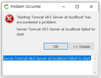 Caused by: org.apache.catalina.LifecycleException: 구성요소 [org.apache.catalina.webresources.StandardRoot@5b39f964]을(를) 시작하지 못했습니다. at org.apache.catalina.util.LifecycleBase.handleSubClassException(LifecycleBase.java:440) at org.apache.catalina.util.LifecycleBase.start(LifecycleBase.java:198) at org.apache.catalina.core.StandardContext.resourcesStart(StandardContext.java:4880) at org.apache.catalina.core.StandardContext.startInternal(StandardContext.java:5018) at org.apache.catalina.util.LifecycleBase.start(LifecycleBase.java:183) at org.apache.catalina.core.ContainerBase.addChildInternal(ContainerBase.java:753) ... 9 more