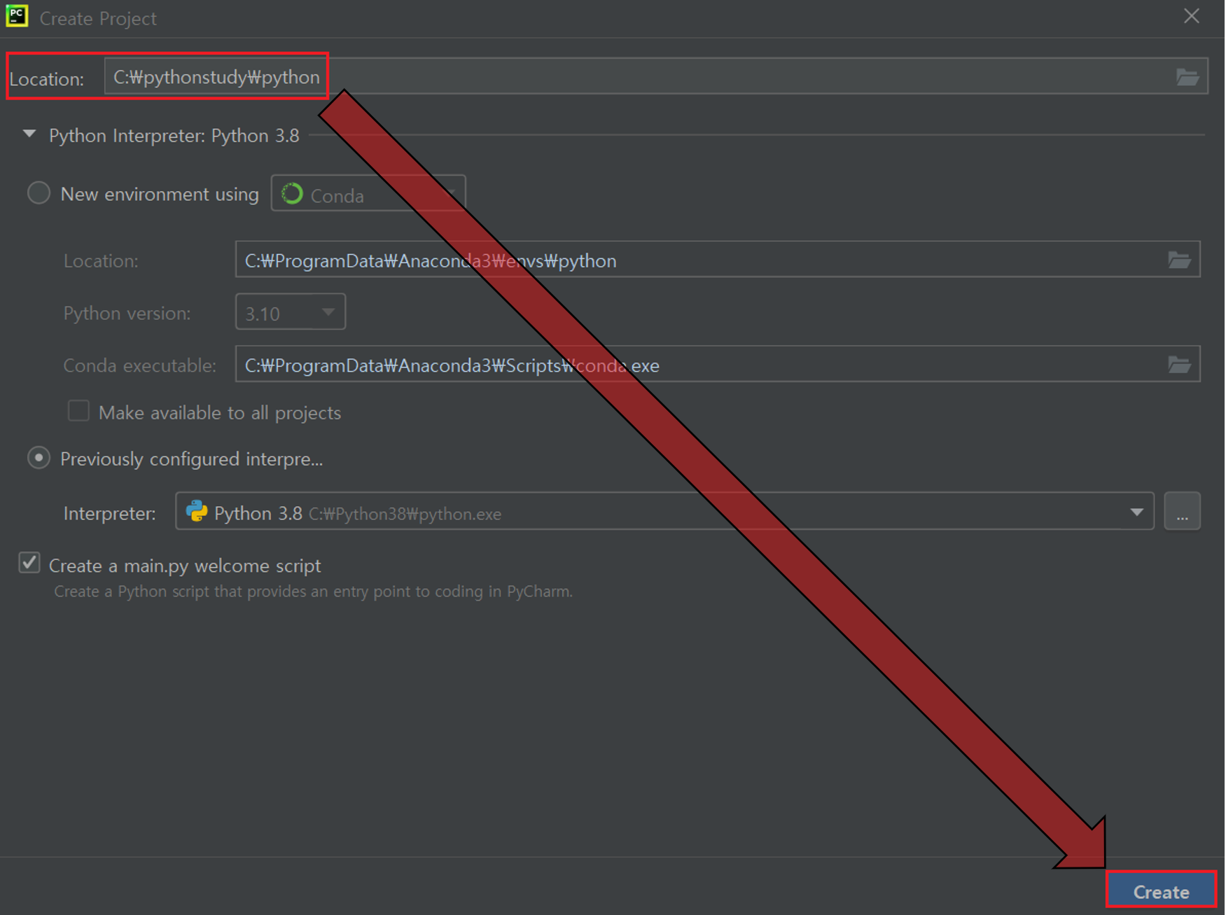 6. 프로젝트 명은 python으로 입력 후 Create 버튼 마우스로 클릭