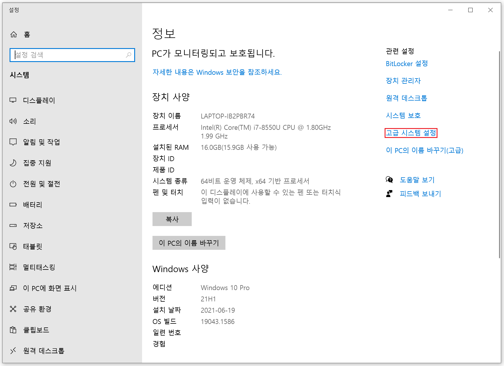 9. 시스템 정보 → 고급 시스템 설정