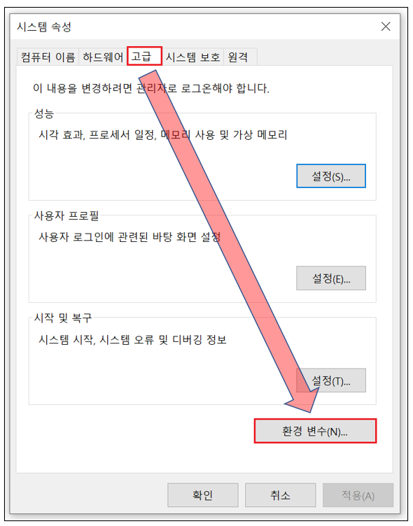 10. 시스템 속성 → 고급 → 환경 변수(N)...