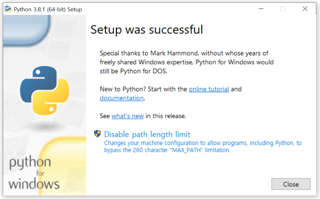 8. Python 3.8.1 설치 완료
