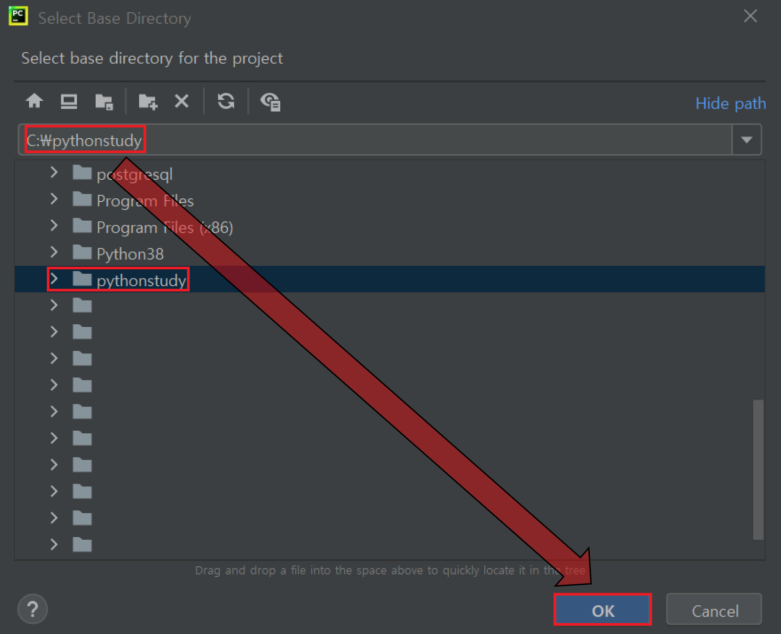5. Select Base Directory - 경로를 C:\pythonstudy로 설정 후 OK 버튼 마우스로 클릭