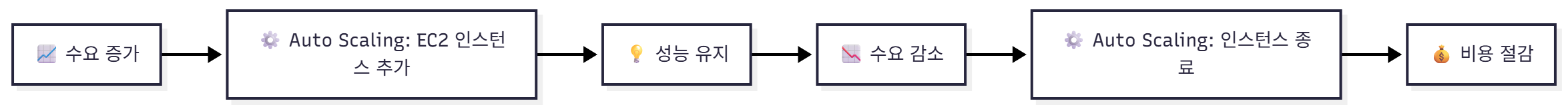 A[📈 수요 증가] --> B[⚙️ Auto Scaling: EC2 인스턴스 추가]