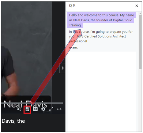 7. CC 옆에 문서모양 클릭하여 동영상 강의 전체 자막(Transcript) 확인