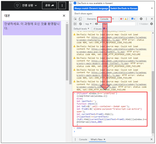 10. Code 입력 후 Enter 친 다음 숫자가 나오면 성공적으로 적용된 것으로 다시 강의로 돌아와도 한국어로 번역되어 플레이됨