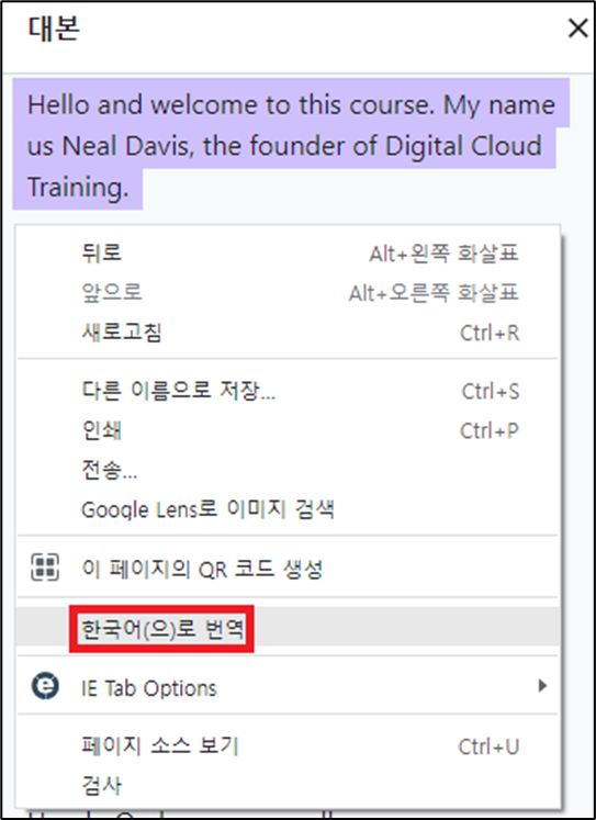 8. 동영상 강의 전체 자막(Transcript)에서 마우스 우클릭하여 한국어로 번역 선택