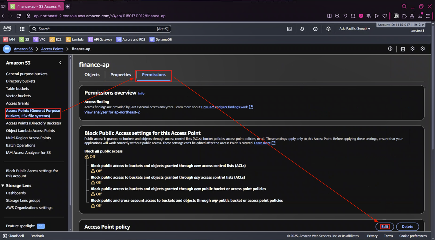 4-1. S3 - Access Points → finance-ap 선택 → Permissions 탭 선택 → Access point policy → [Edit] 버튼 마우스로 클릭