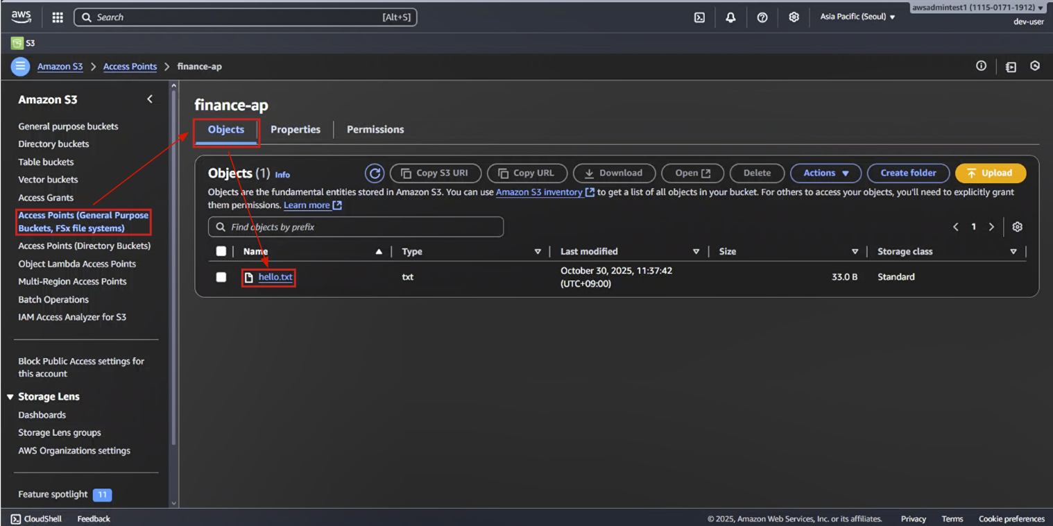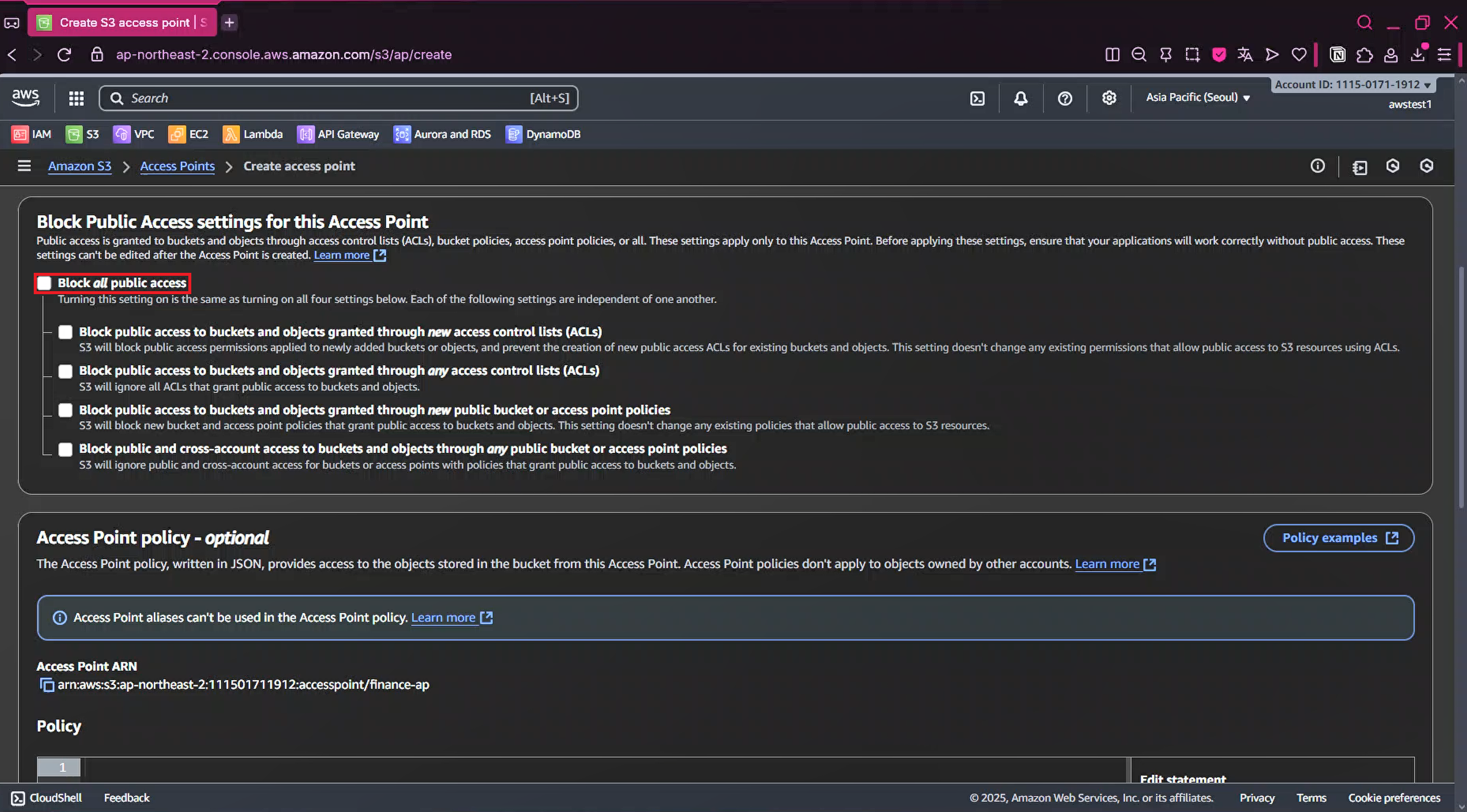 "Resource": "arn:aws:s3:ap-northeast-2:12345678910:accesspoint/finance-ap/object/*"