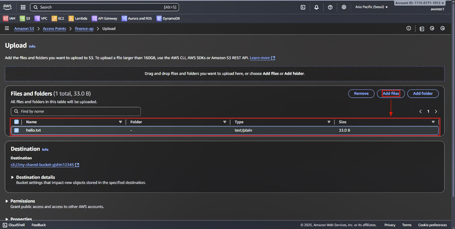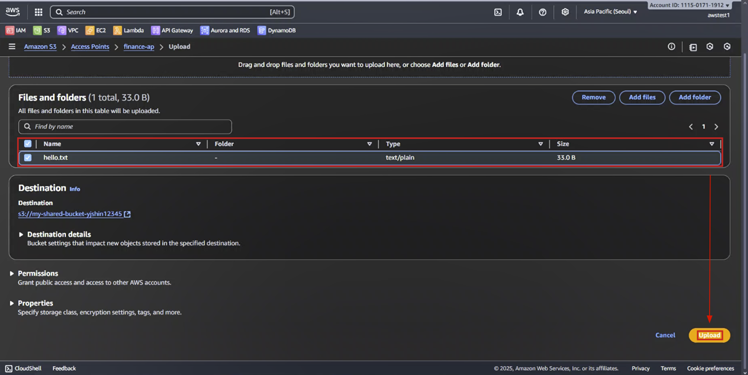 5-1. S3 Access Point - [Objects] 탭 선택 → [Upload] 버튼 마우스로 클릭