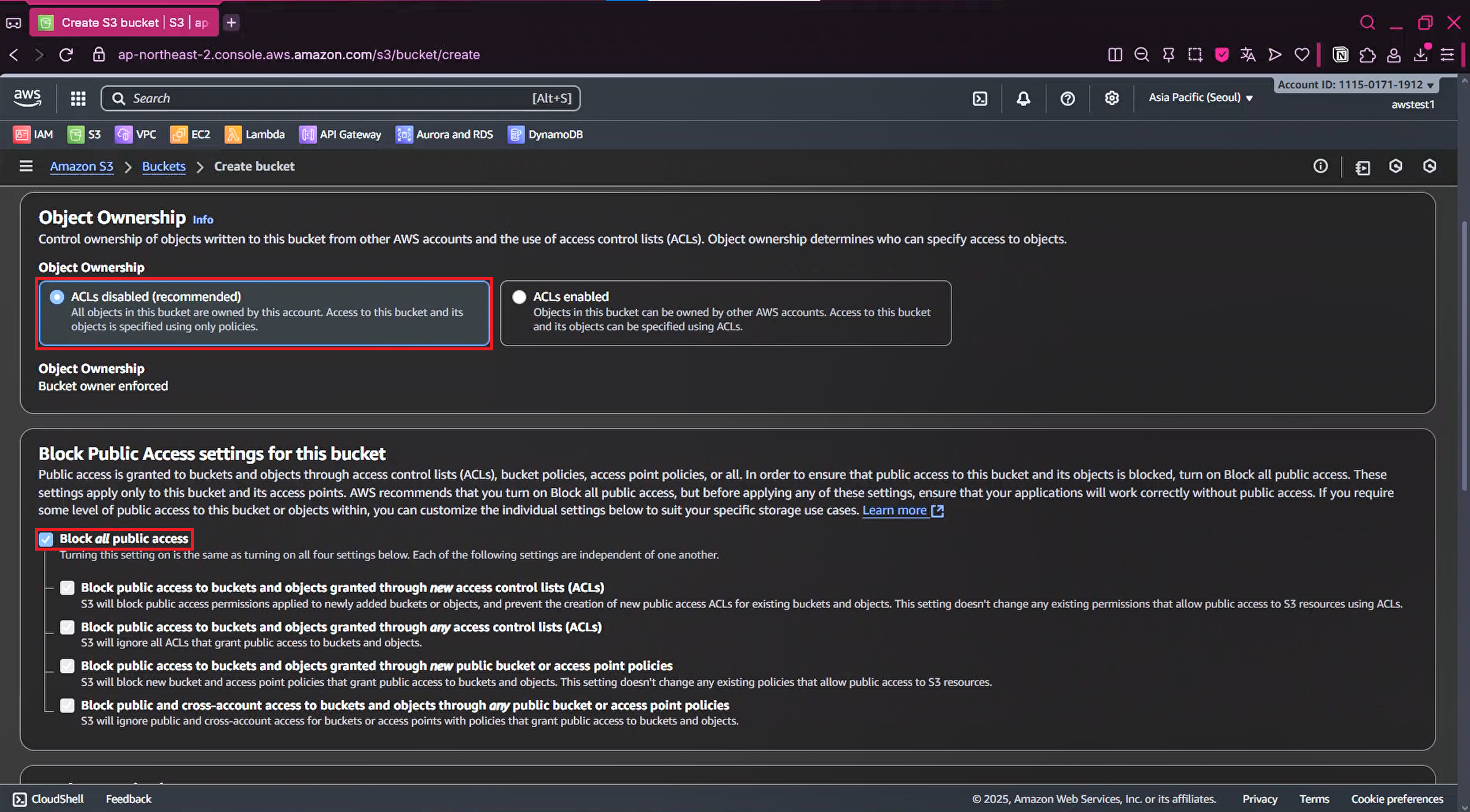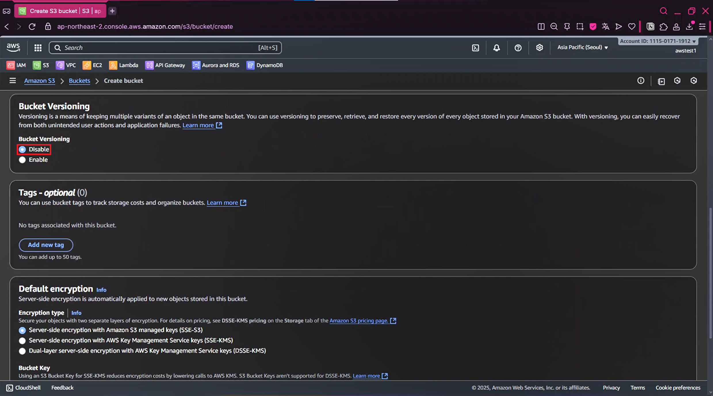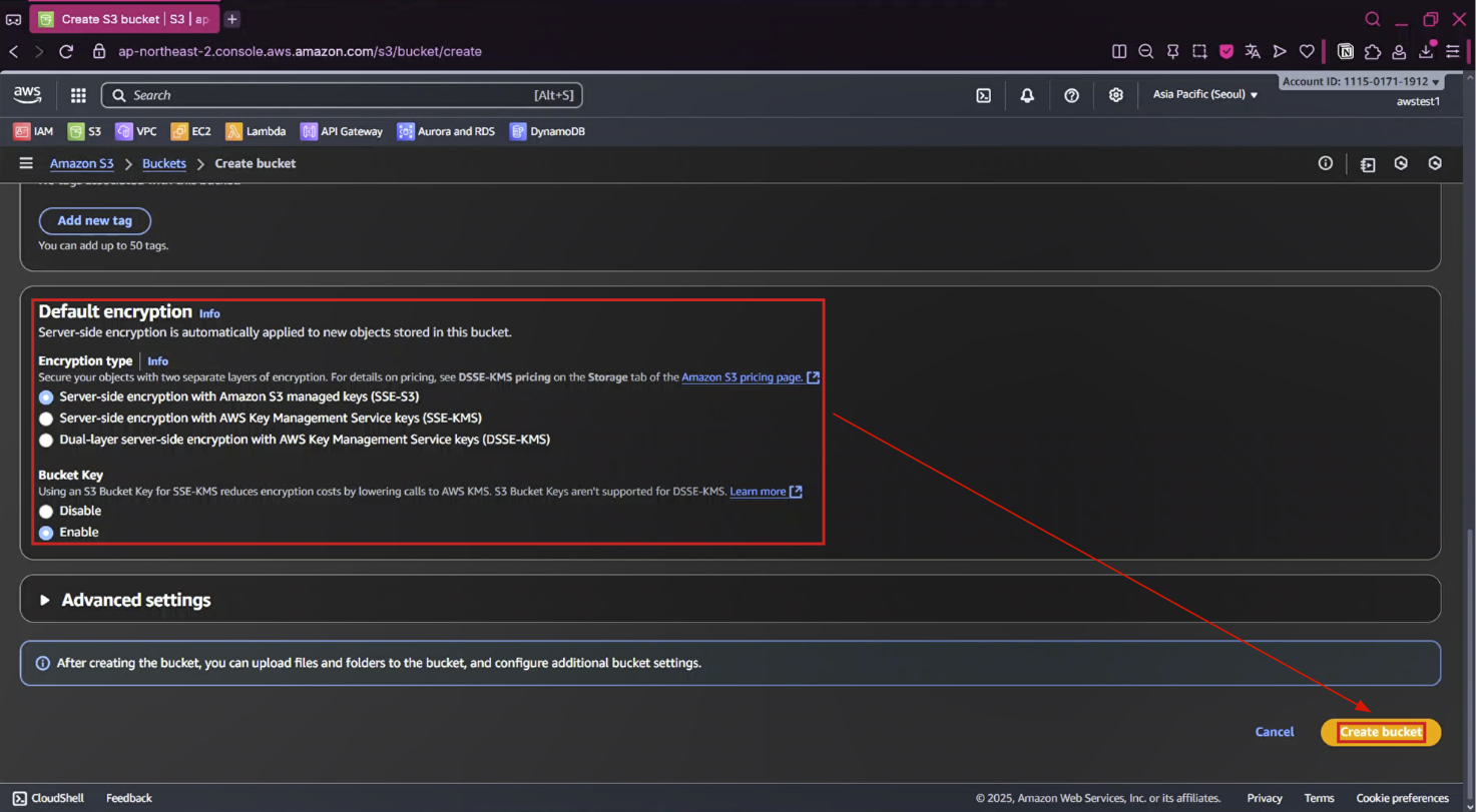 1-5. Encryption Default Setting 유지 → Create bucket 버튼 마우스로 클릭