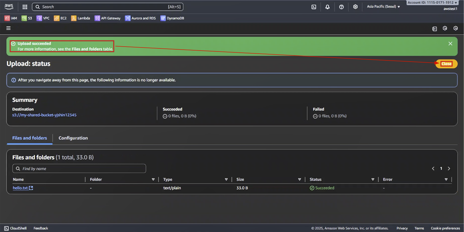 5-4. Upload 완료 메시지 확인 후 [Close] 버튼 마우스로 클릭