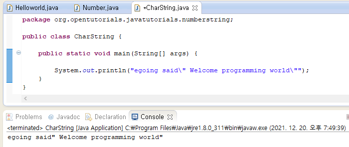 System.out.println("egoing said\" Welcome programming world\"");