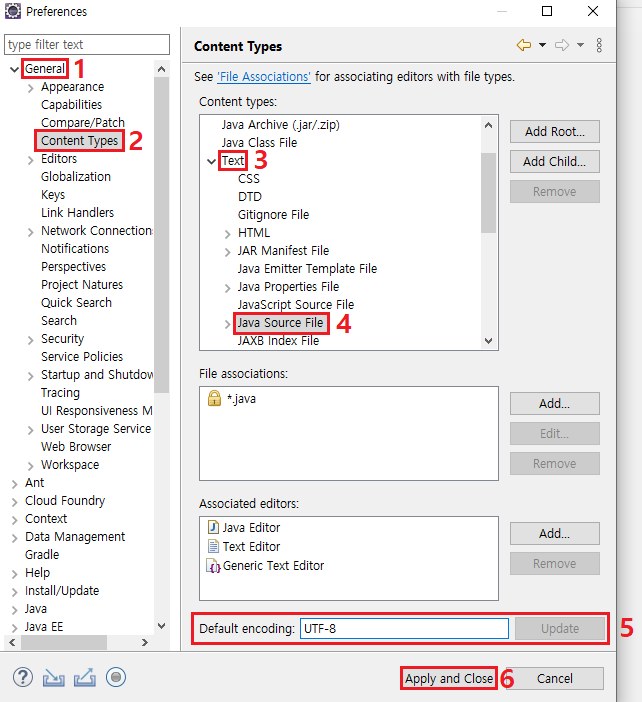 2. Preferences → General → Content Types → Text → Java Source File → Default encoding : UTF-8 입력 후 Update 버튼 클릭 → Apply and Close