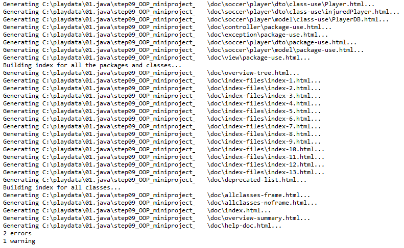 - 에러는 뭔가 뜨지만 javadoc 폴더에 파일들이 정상적으로 생성됨을 확인할 수 있다.