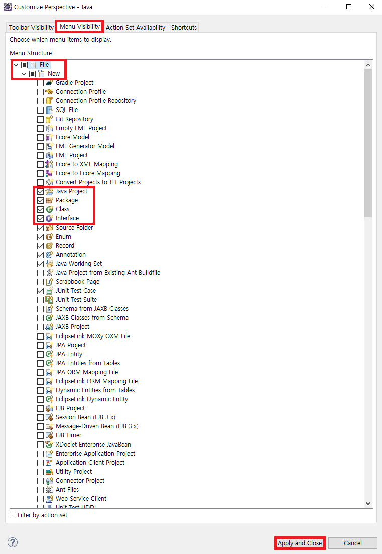 Menu Visibility - File - New - 목록 추가할 항목 체크 - Apply and Close