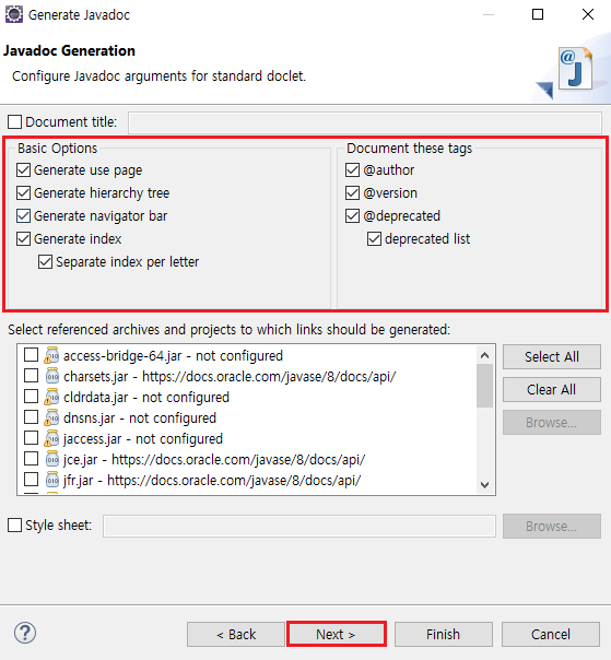 5. Generate javadoc → Use standard doclet 경로 확인 후 Next >