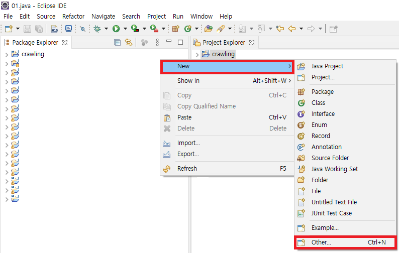 1. Eclipse 실행 후 Project Explorer에서 마우스 우클릭 → New → Other... 선택