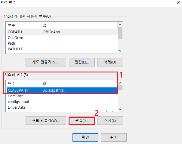 4. 환경 변수 → 시스템 변수(S) → CLASSPATH 선택 후 편집 마우스로 클릭