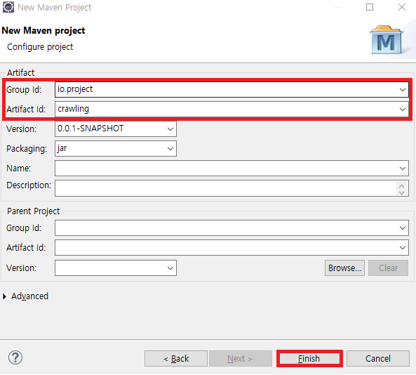 4. [Configure project] Group Id & Artifact Id 입력 후 finish 버튼 마우스로 클릭