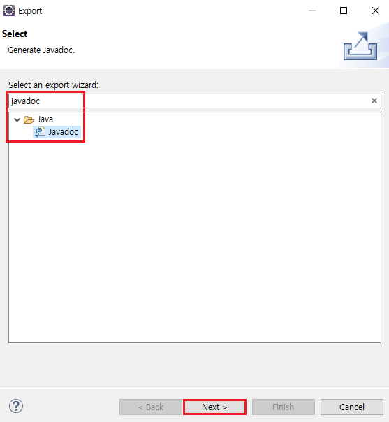 4. Export... → javadoc 입력 후 선택 → Next >