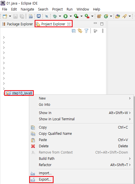3. 좌측 Project Explorer → 프로젝트 마우스 우클릭 → Export...