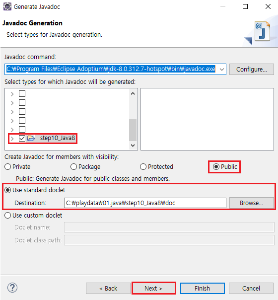 5. Generate javadoc → Use standard doclet 경로 확인 후 Next >