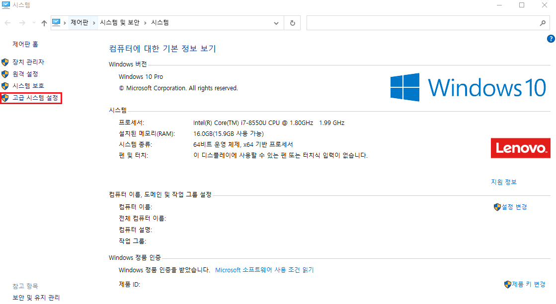 2. 시스템 실행되면 좌측 확인 → 고급 시스템 설정 마우스로 클릭